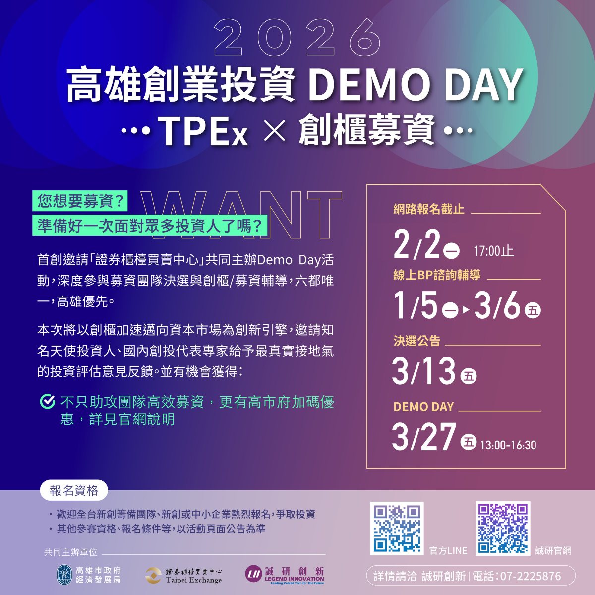 身為創業公司創辦人的你,是否有此困擾:「有足夠資本才能加速商業化,反之,有商業實績才能吸引資本」。為協助創業公司正確對接資本市場,獲得資金與市場人脈來加速成長,今年度的高雄創新創業大賽延續2024與2025創業投資DEMO DAY精神,以爭取股權投資為主的實戰BP活動,讓真正想要募資且已經準備好的團隊有機會一次面對眾多投資人進而達成目標。